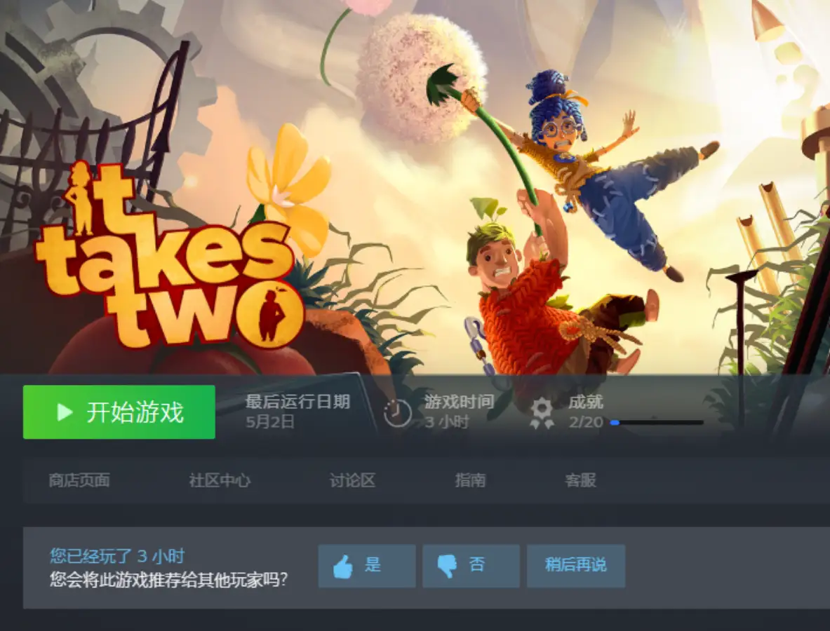 我不太记得双人成行是我今年寒假前还是开学后买的了,总之想玩这个游戏已经是很久以前的事情了。在五一的前一天晚上没有玩上游戏,五一的第一天同样也没有玩上游戏,憋屈的不行,刚好翻游戏看到库里的双人成行还没有动过,于是和小蔡两个没有游戏玩的人启动了双人成行。