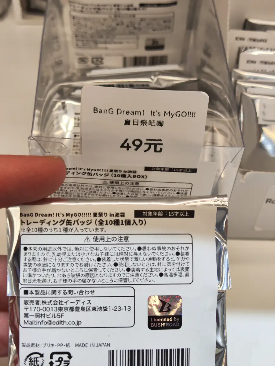 而会展中心这块就明显很跟的上版本了,虽然说数量的确和上海的地下街那块还是差了点,起码东西还是挺新的。至少在这能看到八月初仅在池袋线下卖的 mygo 吧唧了。我还挺纳闷有限购仅线下的这个谷子,这个谷店是怎么搞回来的,难不成雇了大爷大妈代排吗。