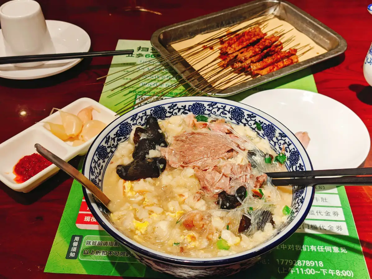 不过泡馍太好吃了,又热气腾腾又顶饱,我还额外点了份串,吃完感觉整个人肚子都大了两圈。