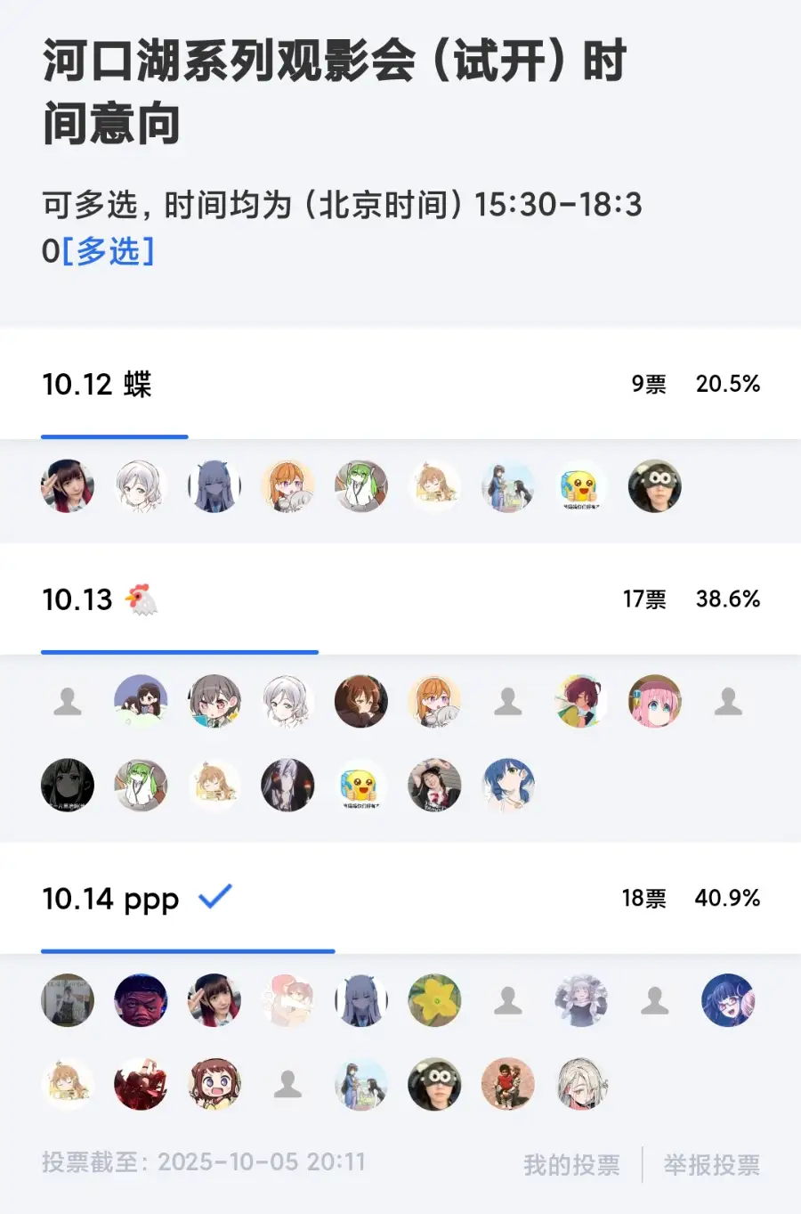 国庆的时候西安的邦群突然开了征集,说是河口湖的 live 要选一天开直播的观影。本来以为鸡会被选上的,结果点进去投票的时候发现 PPP 和鸡不相上下,笑嘻了,PPP 也是好起来了,工作日甚至还能有这么多人来看。
