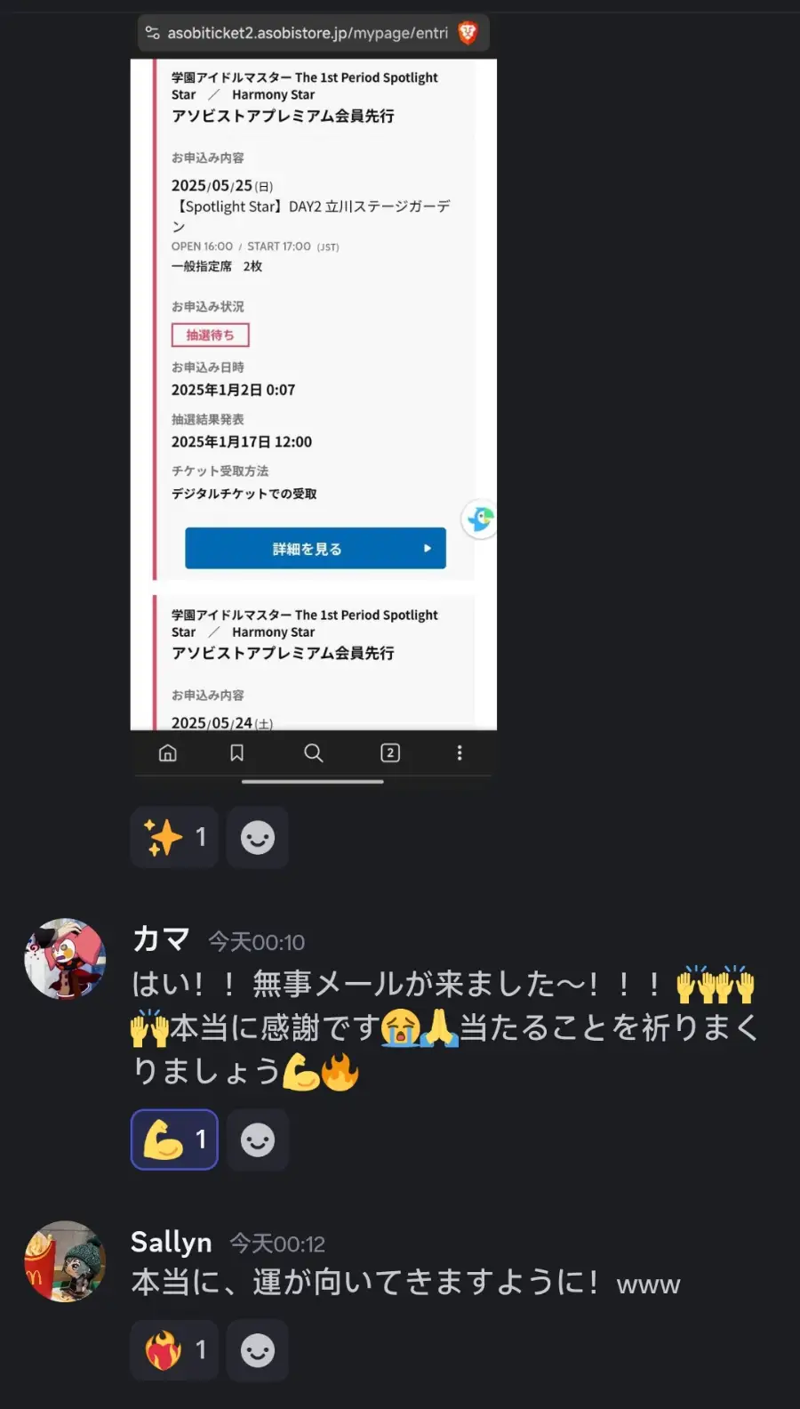 等到新年给认识的人发了一圈祝福,这个时候想起来确实要抽学1了,于是问了一句 yhm 的同行码。不过 yhm 一开始弧了一会消息第二天才把同行码发给我,顺便还滑轨加请多关照二连。嗯,但愿抽的四天里能中一天吧,至少这样还能想办法换到一天的票。如果中的还就是 PPP 武道馆前两天的票就更好了,既可以连番又不需要去换票了。