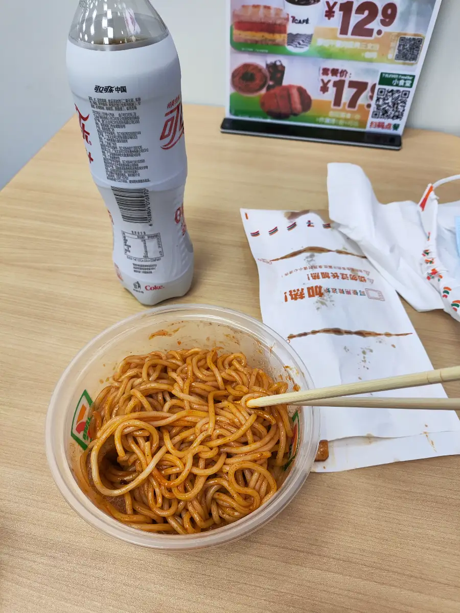 711的菜单还挺丰富的,有汤面拌面甚至还有咖喱饭,剩下的就是一些比较常规的像饭团三明治以及汉堡这样的便当。我想了想反正也不是很着急,于是就花了个14块点了一份车仔面加6个丸子,另外再加一串魔芋,还拿了一瓶可乐。说实话,这已经是我在这边上班吃的最便宜的一顿了,毕竟现在麦当劳的1+1也要14块钱来着了,而且还吃不饱。