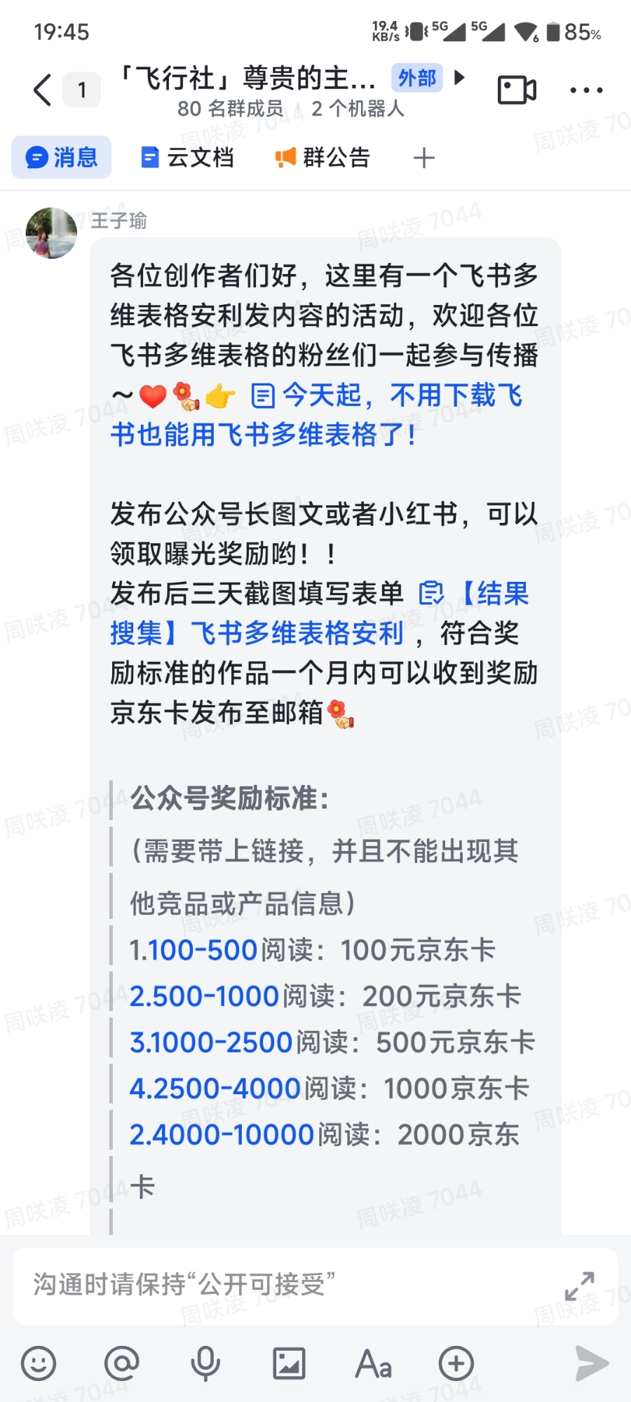 事实上互动的数据也还算是不错,达到了500元京东卡的那一档。但我的这篇文章并不算是完全给飞书打的广告,但是姑且还是尽量按照他们给的要求来了,不知道审核能不能过就是了……500元京东卡可以买点酷态科然后卖闲鱼回一手血倒是……