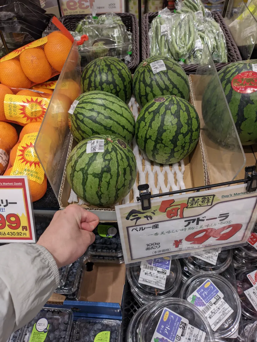 接到梦夏之后,便开始往他家去。不过到站之后,我们并不着急先回,而是先去了附近的一家超市买做饭要用的菜。我因为本身就不会日语而且不太会买菜,于是交给了梦夏负责。不过在路上顺便看了看,看到了一个拳头大小但是要卖5块钱的西瓜,哎,日本。