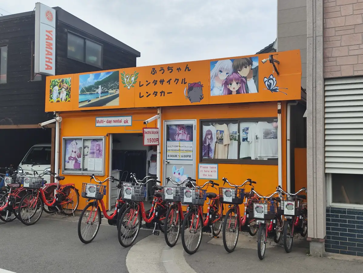 因为直岛的面积比起男木岛大了可不止一点半点,所以租一辆自行车是非常必要的。早就知道港口这边有一家 SP 主题的自行车行,于是下船之后我就直奔这家车行。老板看到我手上男木岛拿到的圣地巡礼传单,自然就知道了我的来意。帮我挑好自行车之后,问我需不需要一张 SP 圣地巡礼的小册子。昨天我拿的是传单,今天拿的是小册子,那我自然欣然接受。租车的价格和左右两边的店铺是差不多的,电动助力车1500一天,到下午6点前还回来即可。骑上单车,开始在直岛的巡礼。