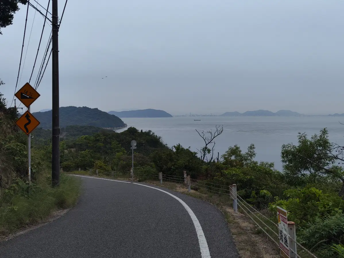 然而前面的道路可以说是十分陡峭,只能说港口有这么多自行车租赁不是没有原因的。哪怕是有电助力也需要把自行车切换到最省力的一档才不需要上坡推着自行车前行。不过当爬到高处之后,剩下的下坡路就很爽了,而且还可以从高处眺望海面,如果今天的天气稍微有一些太阳,那么风景应该不会比昨天的男木岛差。