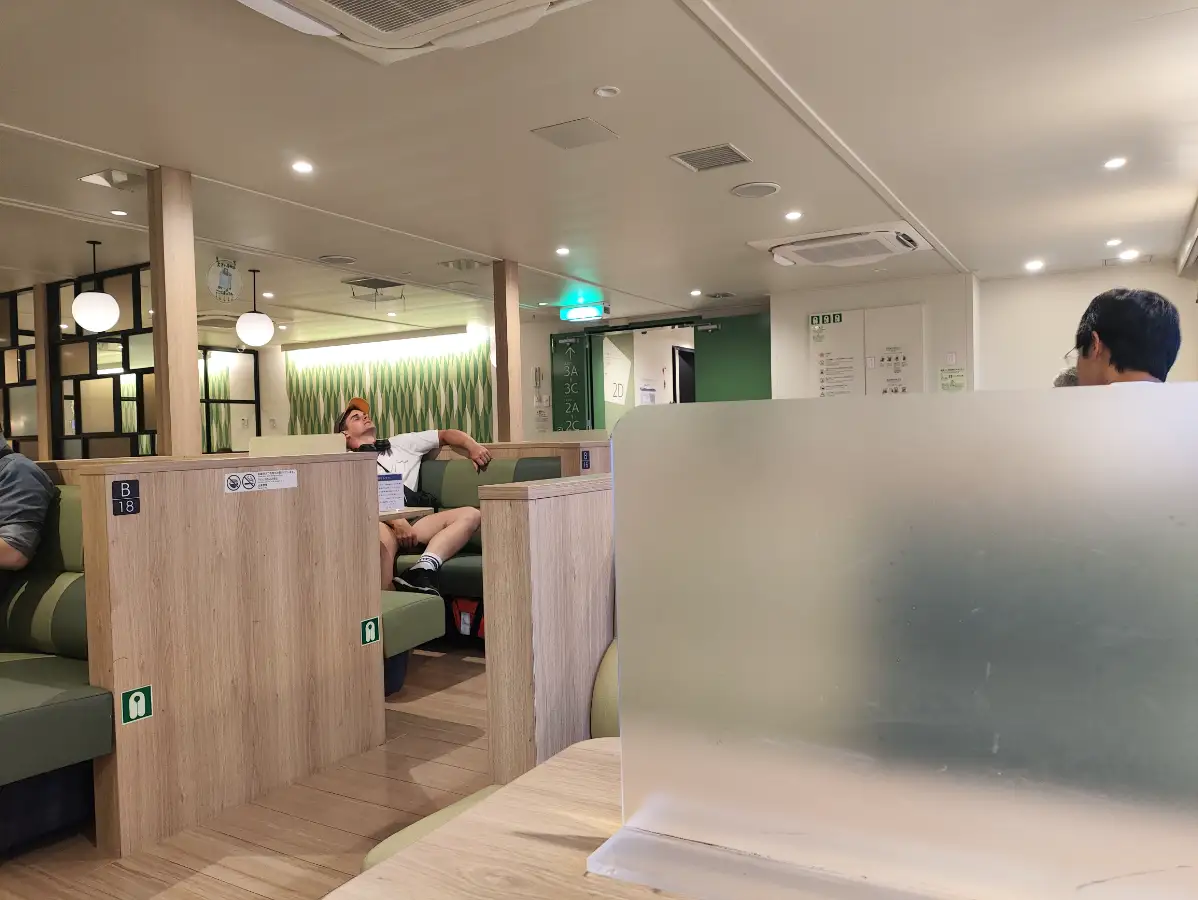 不过在此之前也没有办法,我开始在船上转悠。这座船应该是我这次旅行中坐过的最大的船,在濑户内海艺术祭以及暑假的时候,这座船的乘坐人数应该是不会少的。可能是平日加上运行时间更改了的缘故,船上自由席稀稀拉拉的并没有多少人。除了坐的自由席,也有躺着的自由席,空间非常大,而且环境也非常好。