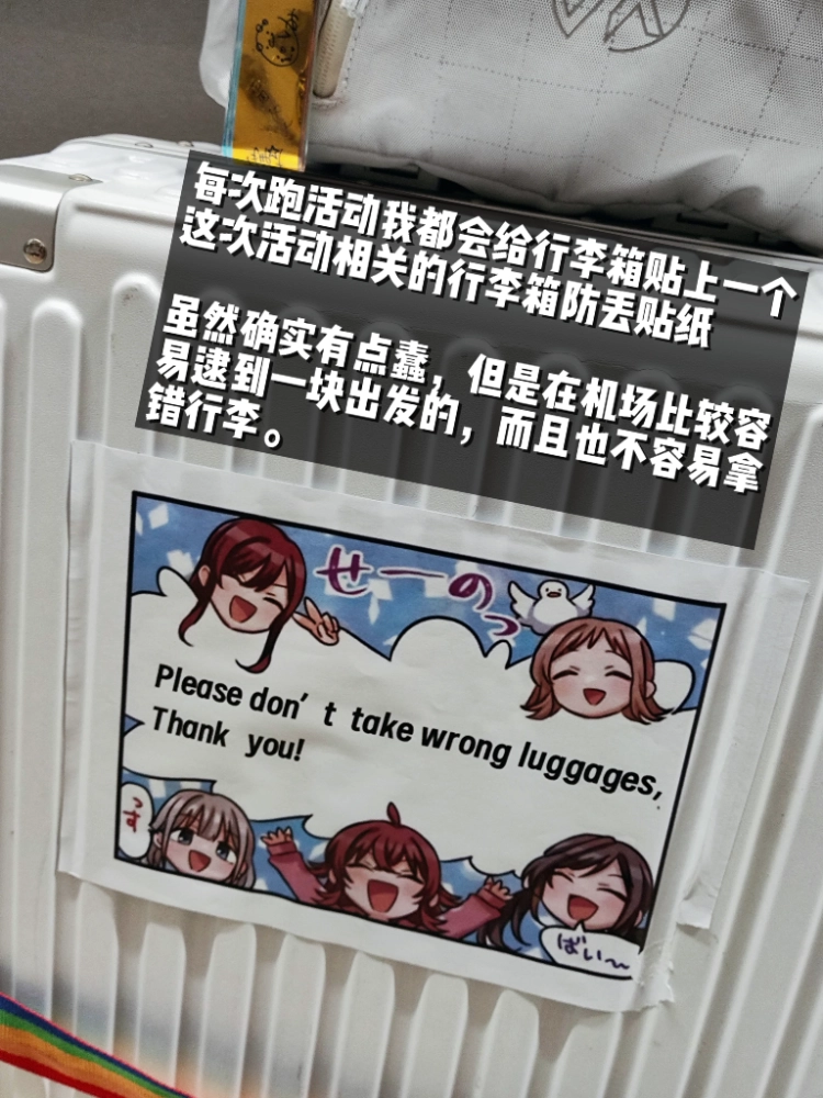 因为防止自己的行李箱在机场碰到同款被别人不小心拿走,其实是为了告诉所有人我是来远征看什么什么活动的。做了一张闪彩条漫风格的“不要错拿我的行李”的贴纸。