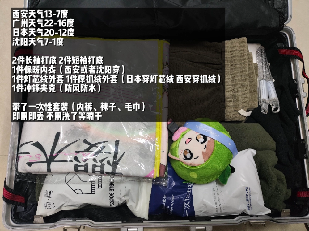 行李箱主要头痛的部分还是衣服,因为西安一个温度,广州一个温度,东京一个温度,沈阳又是一个温度,导致我带衣服的时候陷入了沉思:沈阳最冷但是只是过夜,而且有大巴接送;西安和东京的气温差不多;广州的天气则非常热但是也只是中途中转一下。在最后我把每天的天气都告诉了 AI 然后让 AI 帮我挑的衣服,感觉自己确实有点废人了。