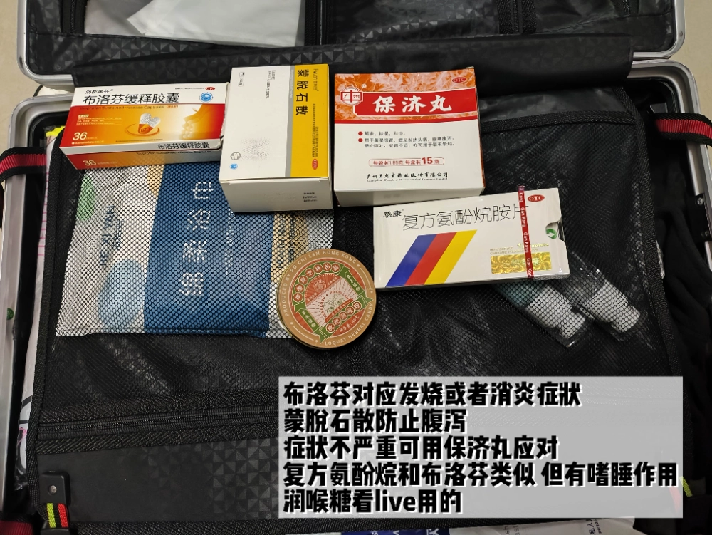 另一边的空间则是基本没用,看了一下放进去了我带的随身小药盒。主要应对的是发炎发烧、腹泻或者肚子疼、喉咙不舒服的几种情况。有的时候如果不注意看 live 喊太猛了,第二天嗓子是真的会痛的。