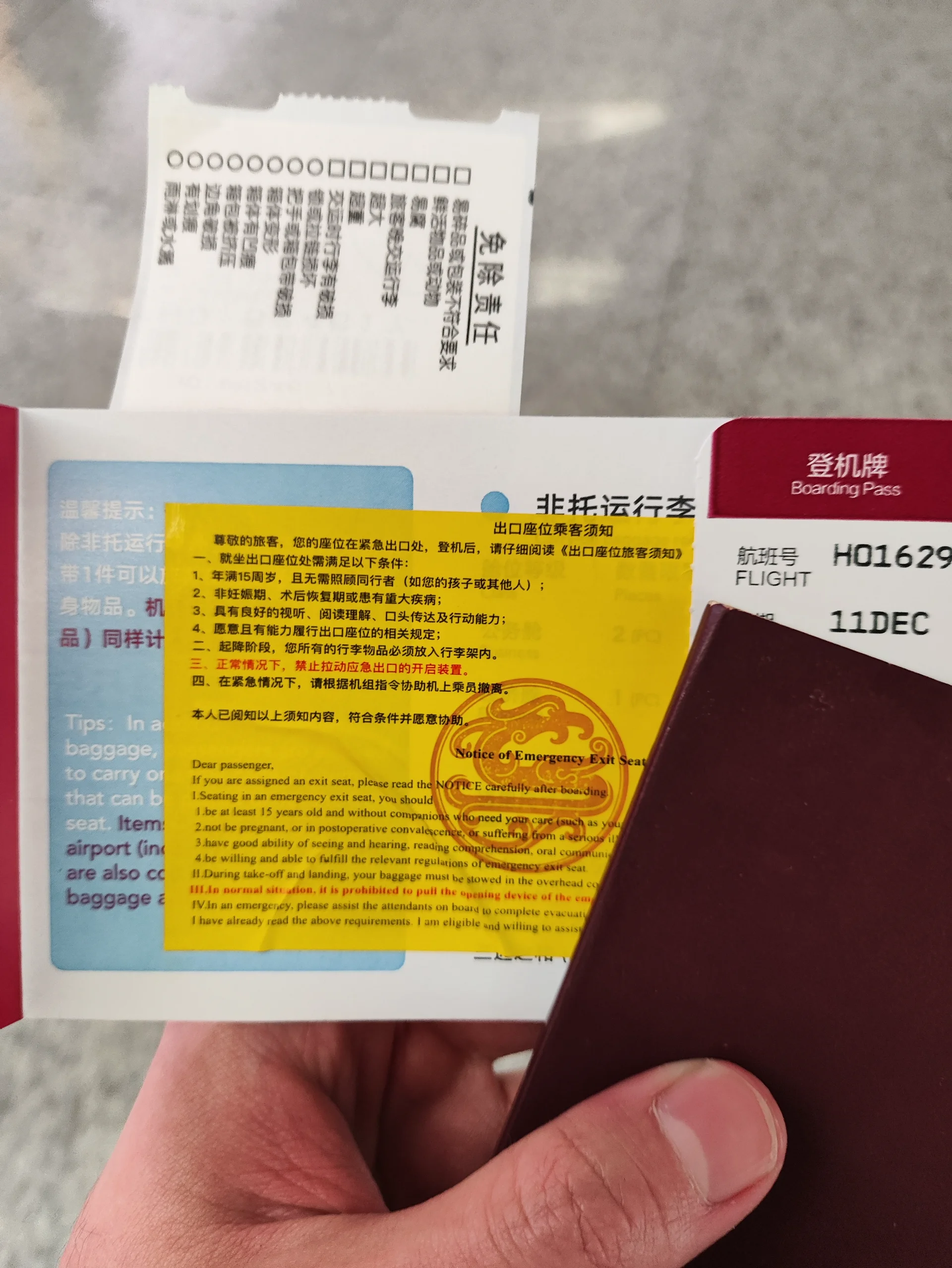 告别东哥之后,我前往航站楼内办理值机和托运。值机的时候提了一嘴可不可以给我安排到紧急出口位置,在听完了说明事项之后,我成功获得了一张紧急出口的座位,看来线下每次值机的时候问一嘴还是非常管用的。