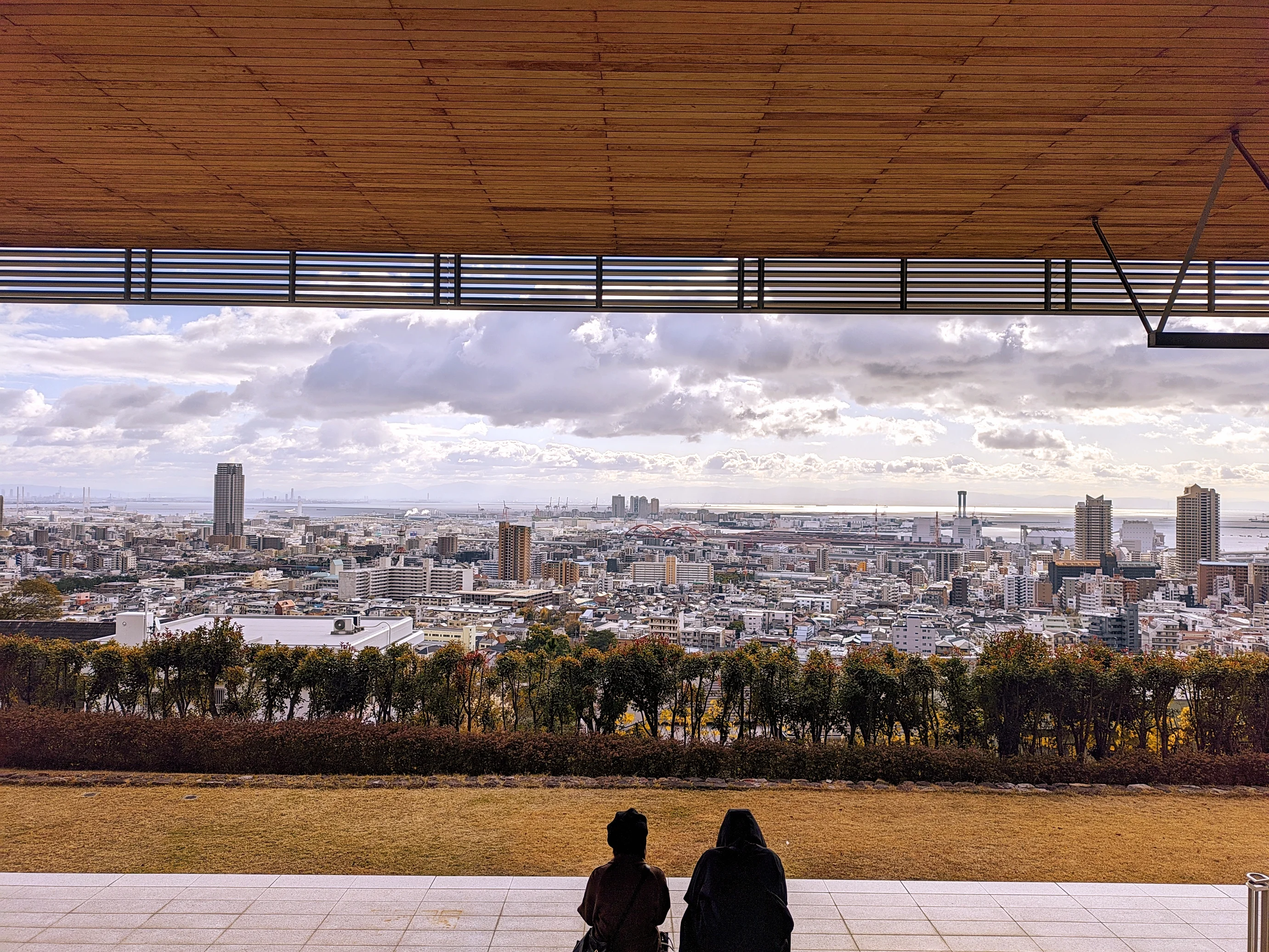 到了神户大学之后,前往百年纪念馆,就可以直接看到观景台了。看上去或许是因为是工作日的大早上,所以这个时候人并不是很多,来这里的人大多数也是游客,带着一台相机,或拍照,或坐在台阶上欣赏风景。