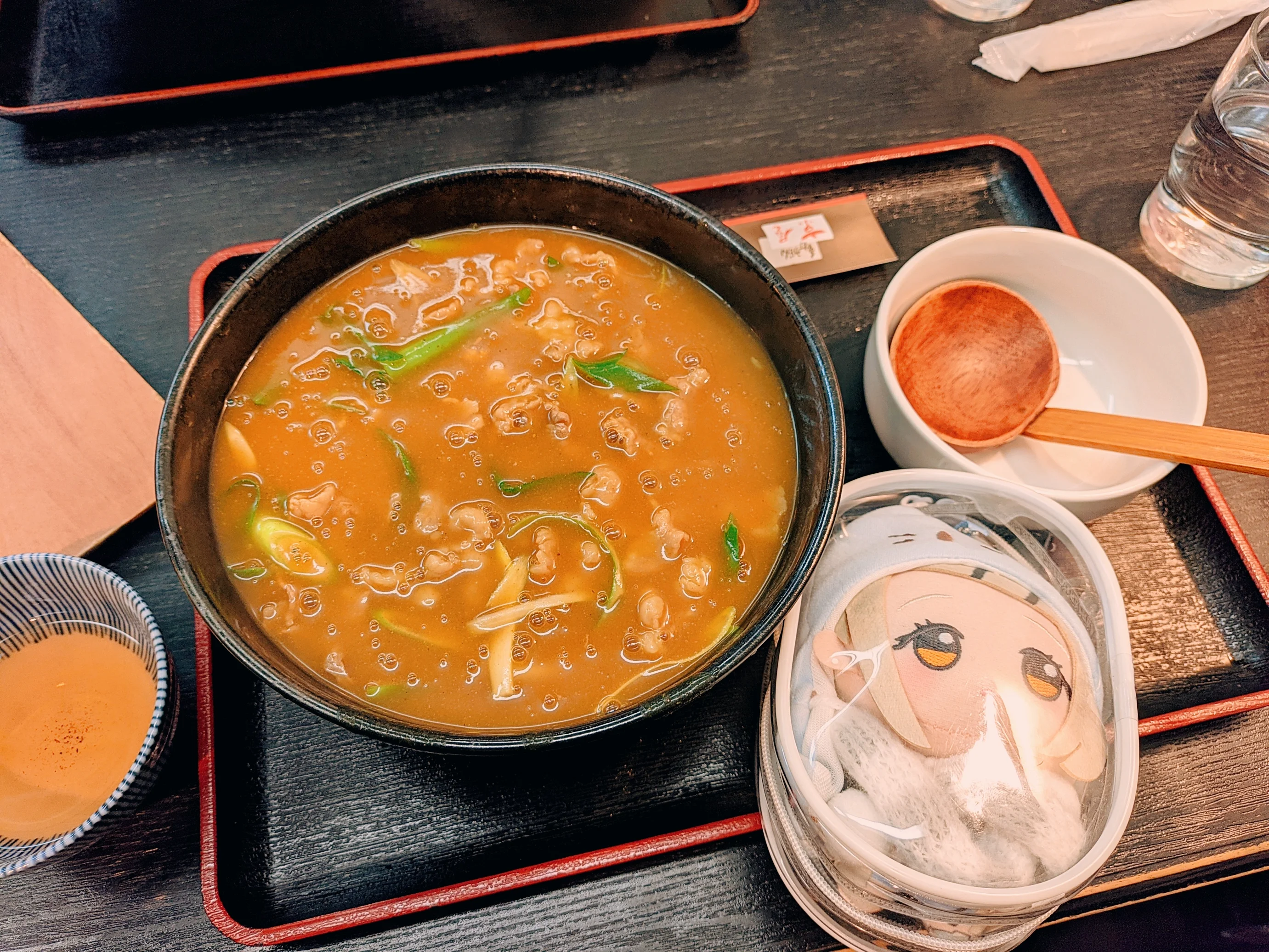 吃过鲷鱼烧之后,我们前往我刚才已经查好的一家人均在1000日元以下的乌冬面——うどん 京屋,还好我们去的时间并不算特别晚,赶上了就餐的高峰期,所以不用排队。我点了一份咖喱乌冬 没错就是因为那个咖喱乌冬的meme leo点了一份炸猪排咖喱乌冬,两个人都差不多是1000日元以下就搞定了一顿饭。而且端上来的时候我感觉已经有国内的小份或者中份差不多的大小了,吃完了之后确实感觉有个7分饱的状态。