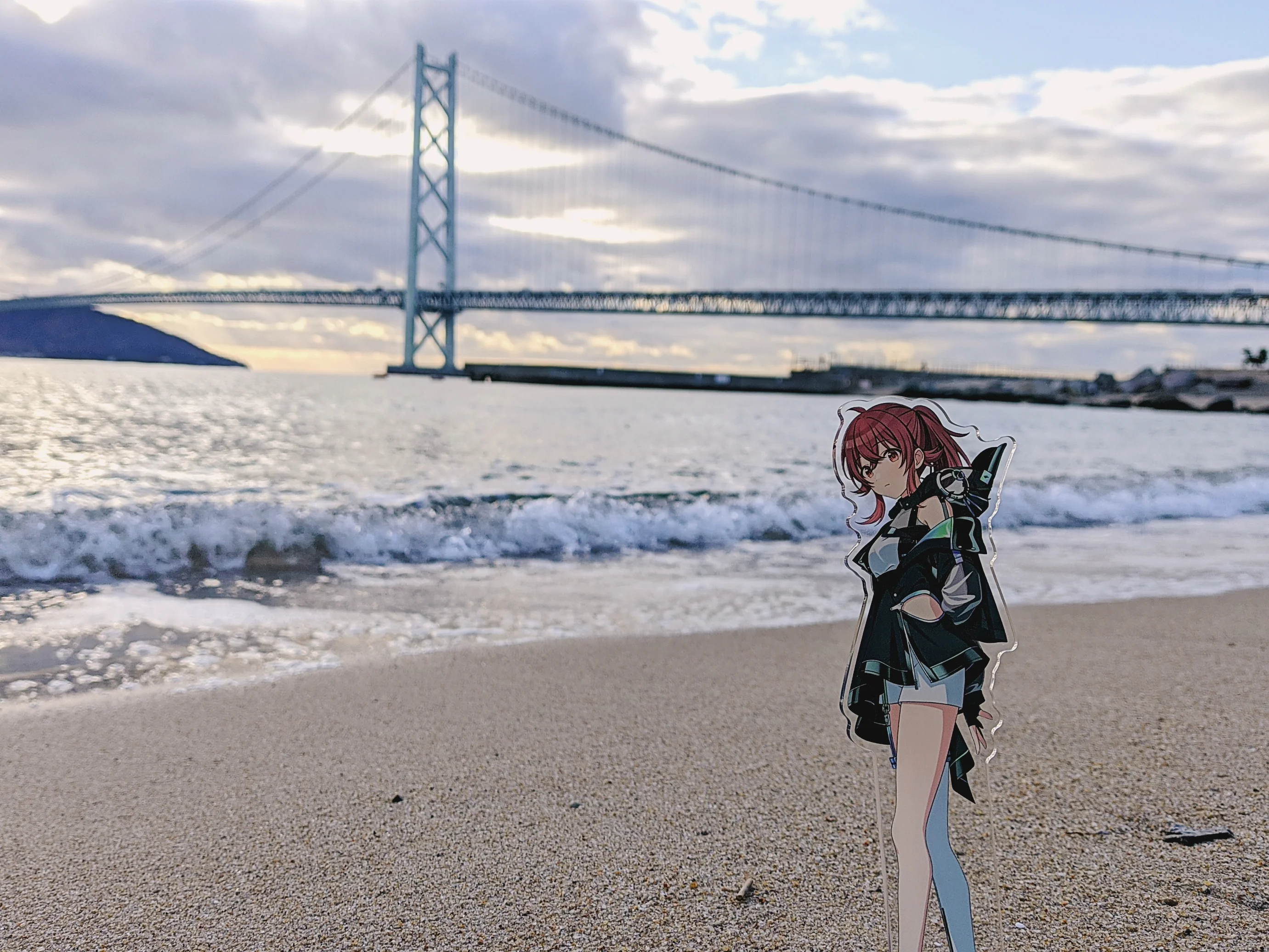 来的时候,舞子的云依旧很多,因为感觉一时半会云不会散开,而且我们的温泉在东边,于是我提议先去东边的沙滩上消磨一下时间。在沙滩上,我把立牌拿了出来,插进了沙子里,拍下了和去年一模一样的构图的照片。