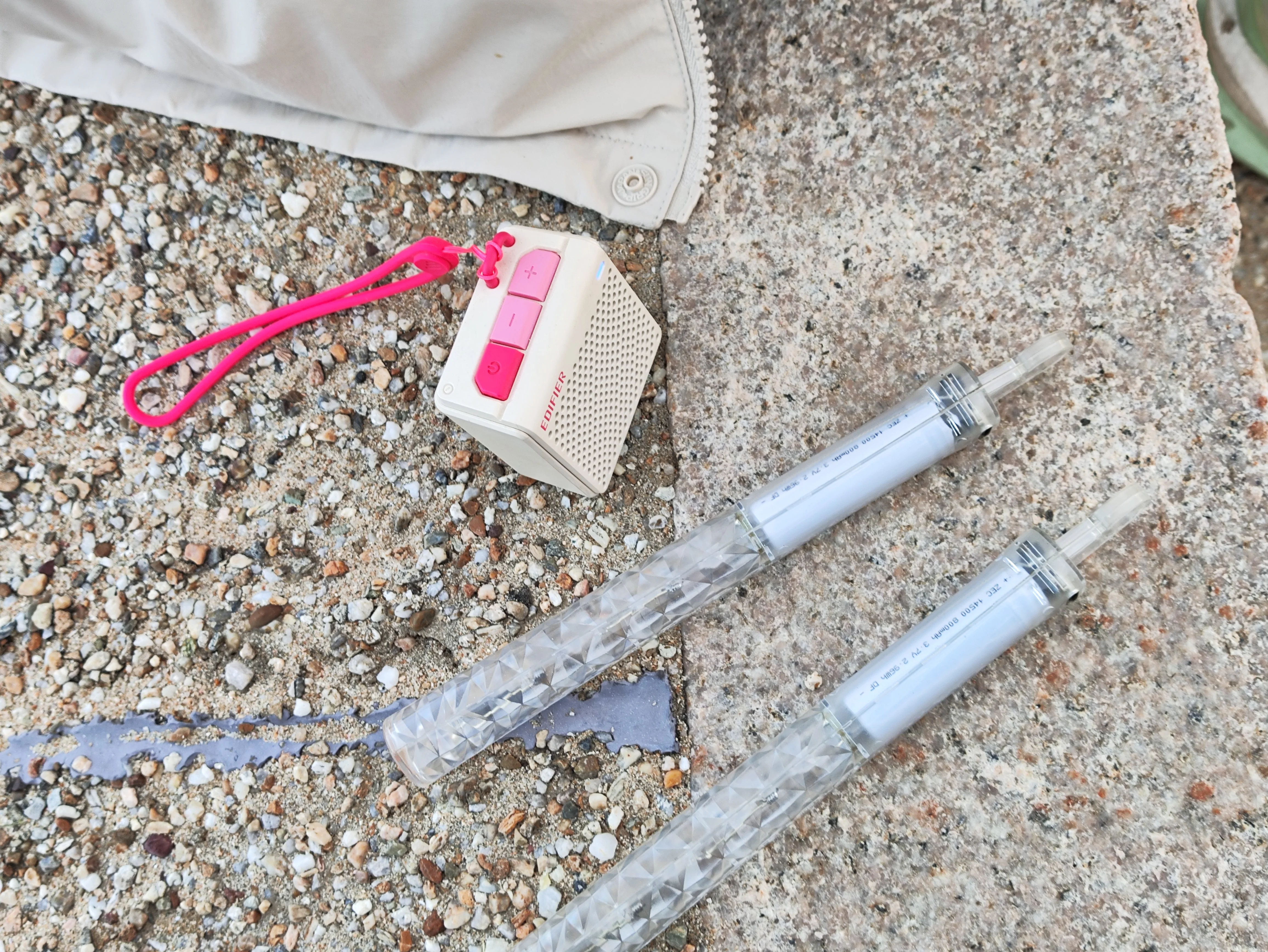 太阳越来越接近海平面,但是云层也逐渐飘了过来。离岸风从我的背后呼呼的吹来,把我冷的不行。这个时候我摸了摸我的背包,摸到了一个硬硬的方方的东西——我的蓝牙音箱!原来是我之前一直没有掏出来,在这个日落时分的舞子沙滩,让我想到了非常好玩的东西。于是我把我的彩带、棒子全部掏了出来,连上音箱,不知道放什么,既然gop在场,那就放一首《エガクミライ》吧。