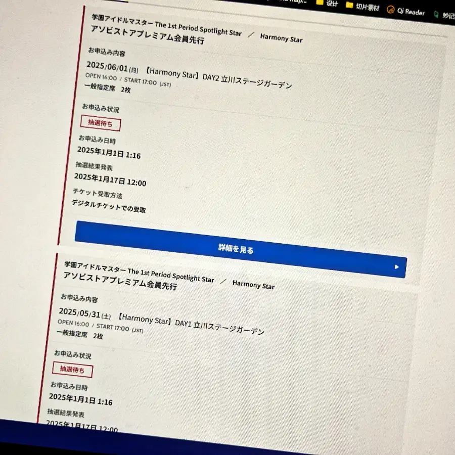 等到新年给认识的人发了一圈祝福,这个时候想起来确实要抽学1了,于是问了一句 yhm 的同行码。不过 yhm 一开始弧了一会消息第二天才把同行码发给我,顺便还滑轨加请多关照二连。嗯,但愿抽的四天里能中一天吧,至少这样还能想办法换到一天的票。如果中的还就是 PPP 武道馆前两天的票就更好了,既可以连番又不需要去换票了。