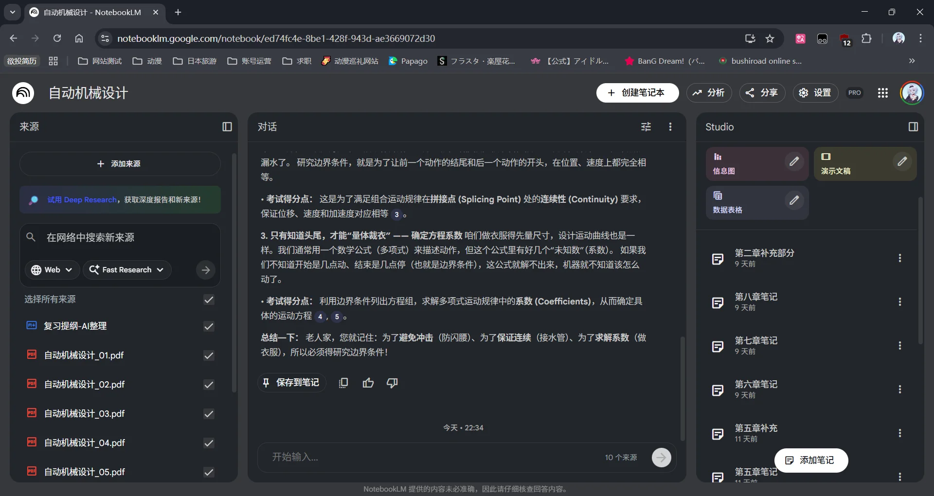 我首先先把老师的PPT转成了PDF导入到左侧的资料中,然后复习一张我就勾选一章的PDF,同时一直保持我已经整理好的那个复习重点的文件的勾选。这样可以保证AI的上下文不会有太大的压力,可以专注一章的复习。在对话中我让AI根据教材和重点复习内容找出知识点并且整理成即使是一个零基础的人也能看懂的水平,等到整理出了满意的版本就添加到右侧的笔记中。右侧的笔记又可以反过来添加到左侧的资料中。