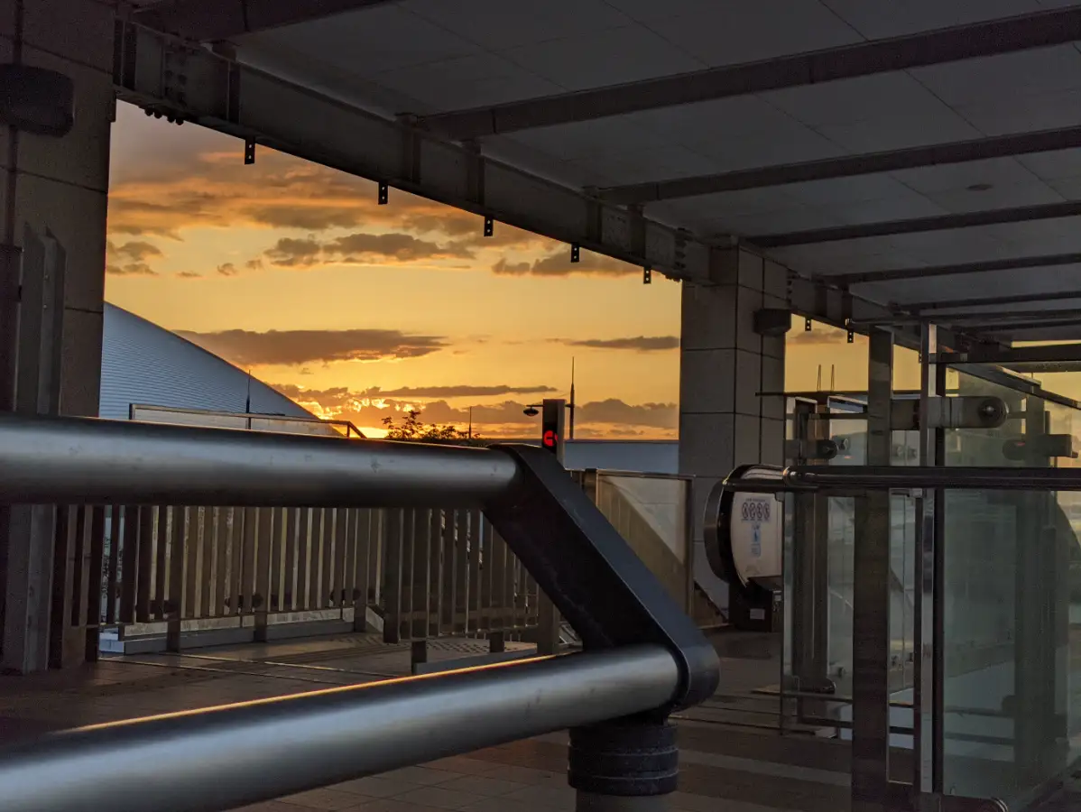 到达海滨公园,这里已经聚集了不少的人,但是公园里却格外的安静。大家都不约而同的坐在台阶上,望着远处那一轮逐渐没入海平面以下的落日。没有喧闹,在这一刻仿佛可以看见时间的流逝,随着太阳的移动一点点消逝。我也找了个座位坐下,旁边的一对日本夫妻也正坐着看着远处的太阳出神。他们时不时小声向对方说一两句话,又归于沉默,大家都不愿意打扰这日落时分的安宁。最终,太阳没入了海面以下,而落日的余晖仍旧映照在天空上,海面又将天空的金黄反射,所以看上去远处的海面是一片金黄。