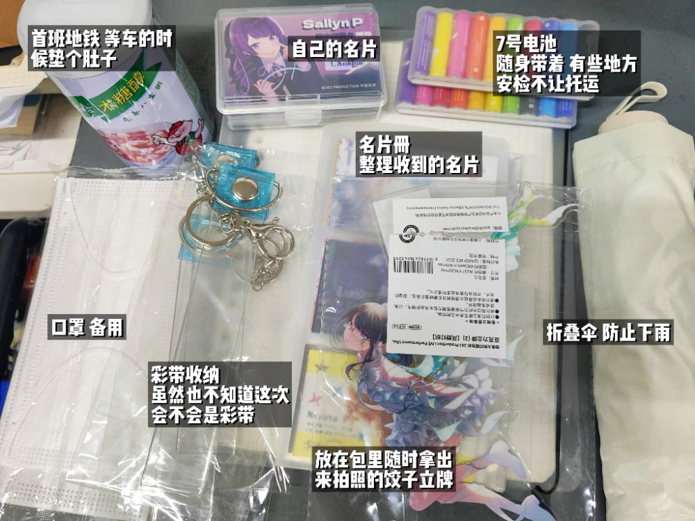 背包装得东西不是特别多,基本上也是一些消耗品,随着日子的过去会越来越少减轻我的负重的。因为要去坐首班地铁所以这次还是买上了一罐八宝粥。另外考虑到有的时候机场会把我的电池拦下,所以这次电池就带在了身上。这次和过去多带了彩带的收纳,不过理论上来说 miniso 或者2元店卖的那种化妆品小分装盒应该才是现地捡到彩带最方便的收纳方式。