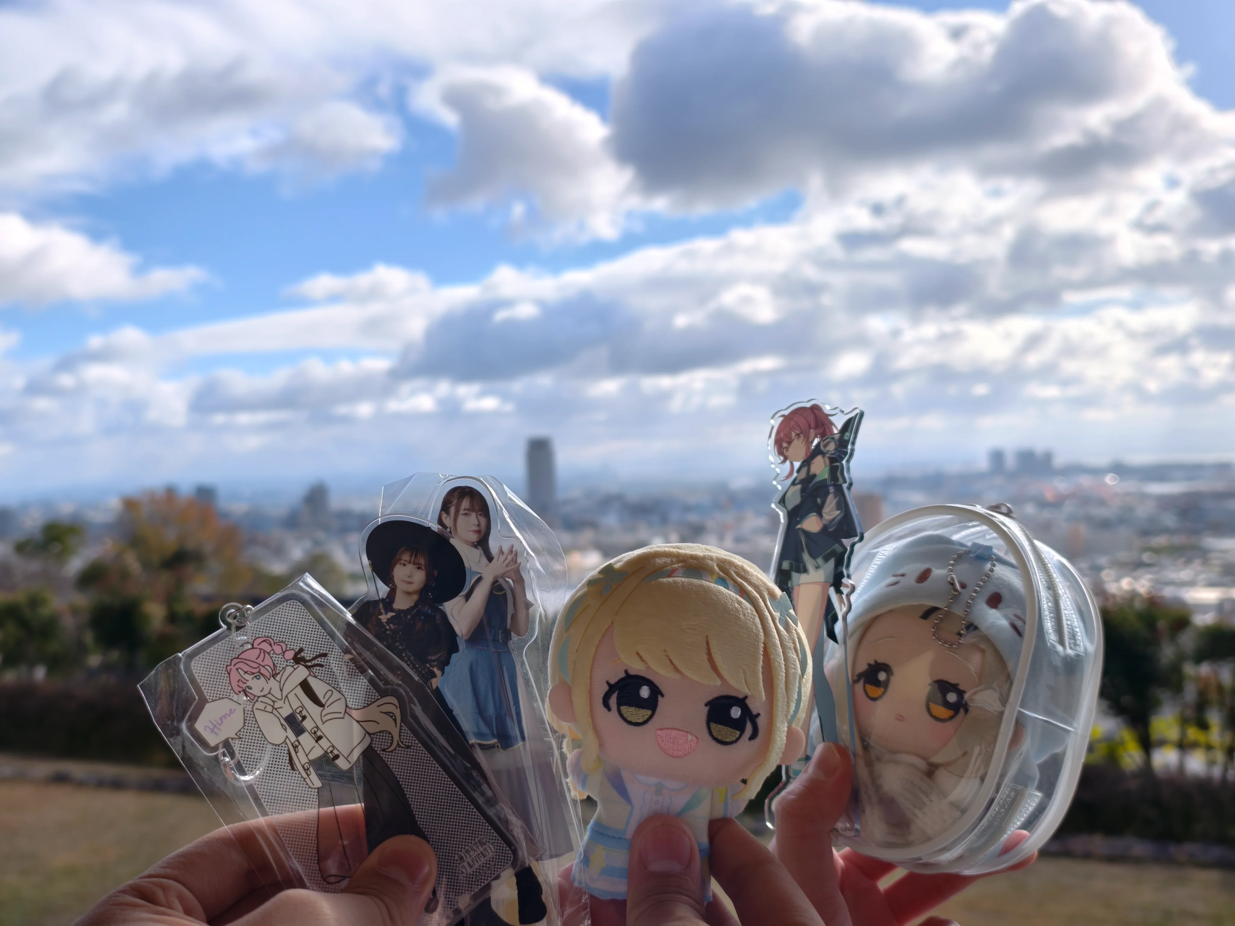 来的时候,舞子的云依旧很多,因为感觉一时半会云不会散开,而且我们的温泉在东边,于是我提议先去东边的沙滩上消磨一下时间。在沙滩上,我把立牌拿了出来,插进了沙子里,拍下了和去年一模一样的构图的照片。